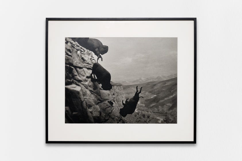 Nemoguće mi je da se sada ne setim jedne od mojih omiljenih fotografija ikada. U pitanju je Untitled (Buffalos), a autor je američki umetnik i AIDS aktivista Dejvid Vojnarovič. Reč je zapravo o diorami iz Nacionalnog muzeja američke istorije u Vašingtonu koja prikazuje tradicionalni način na koji su američki starosedeoci lovili bizone: Poterali bi ih preko pustara i prerija, pa ih naterali da skoče sa litice u ambis. Vojnarovič je uzeo samo jedan frejm ove diorame i odštampao ga u crno-beloj tehnici, a rezultat impresivan: Krdo bizona koji se u slobodnom padu strmoglavljuju niz liticu i odlaze u smrt. Dobro se sećam kada sam je prvi put video pre mnogo godina i odmah mi se urezala u pamćenje. Tek sam kasnije saznao više o Vojnaroviču i tome kako su njegovi Buffalos u stvari bili alegorija decenije u kojoj je živeo dok je umirao od side.
